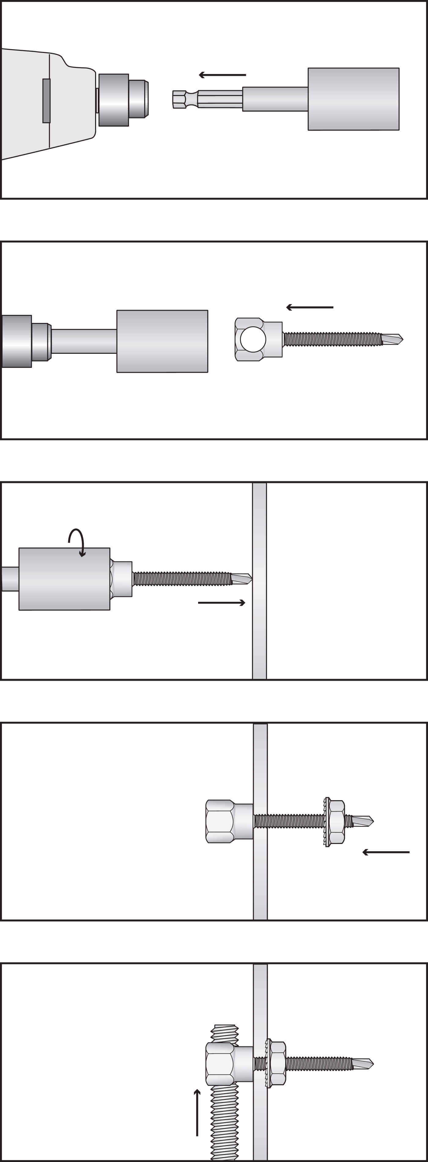 - Mount the Universal Steel & Wood Socket Drive (Part No. HTWSST) into the chuck of the drill.