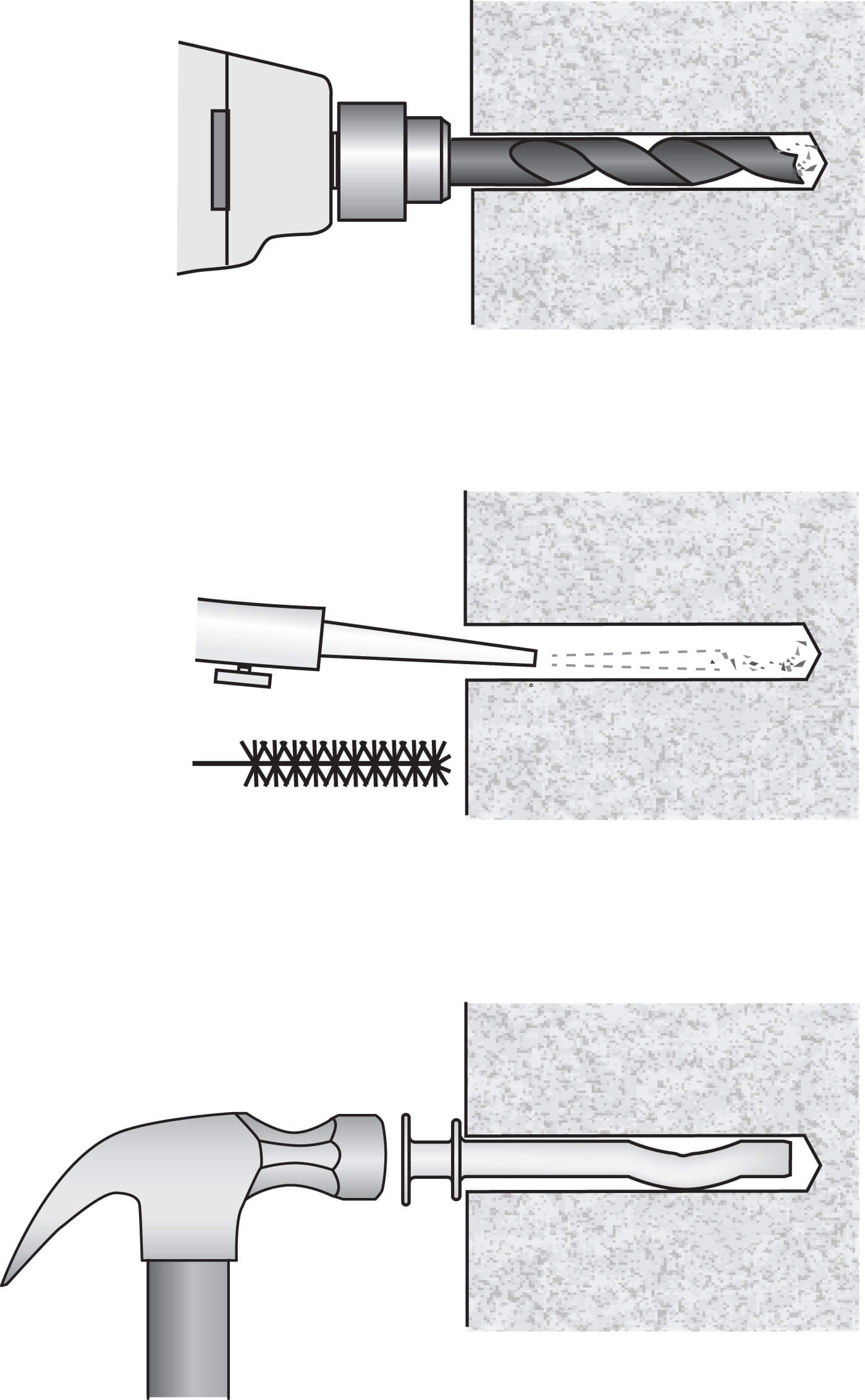 - Drive anchor through the fixture into the hole making sure the head solidly against the fixture. Be sure the anchor is driven to the required embedment depth.