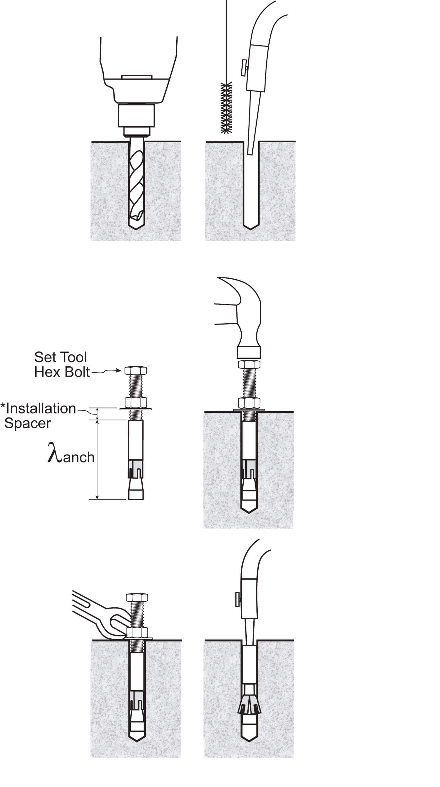 - Insert the setting tool into the threaded end of the anchor and expand the anchor by striking the end of the setting tool with a hammer. The anchor is set (fully expanded) when the shoulder of the setting tool touches the anchor. Full expansion is necessary for proper anchor performance.