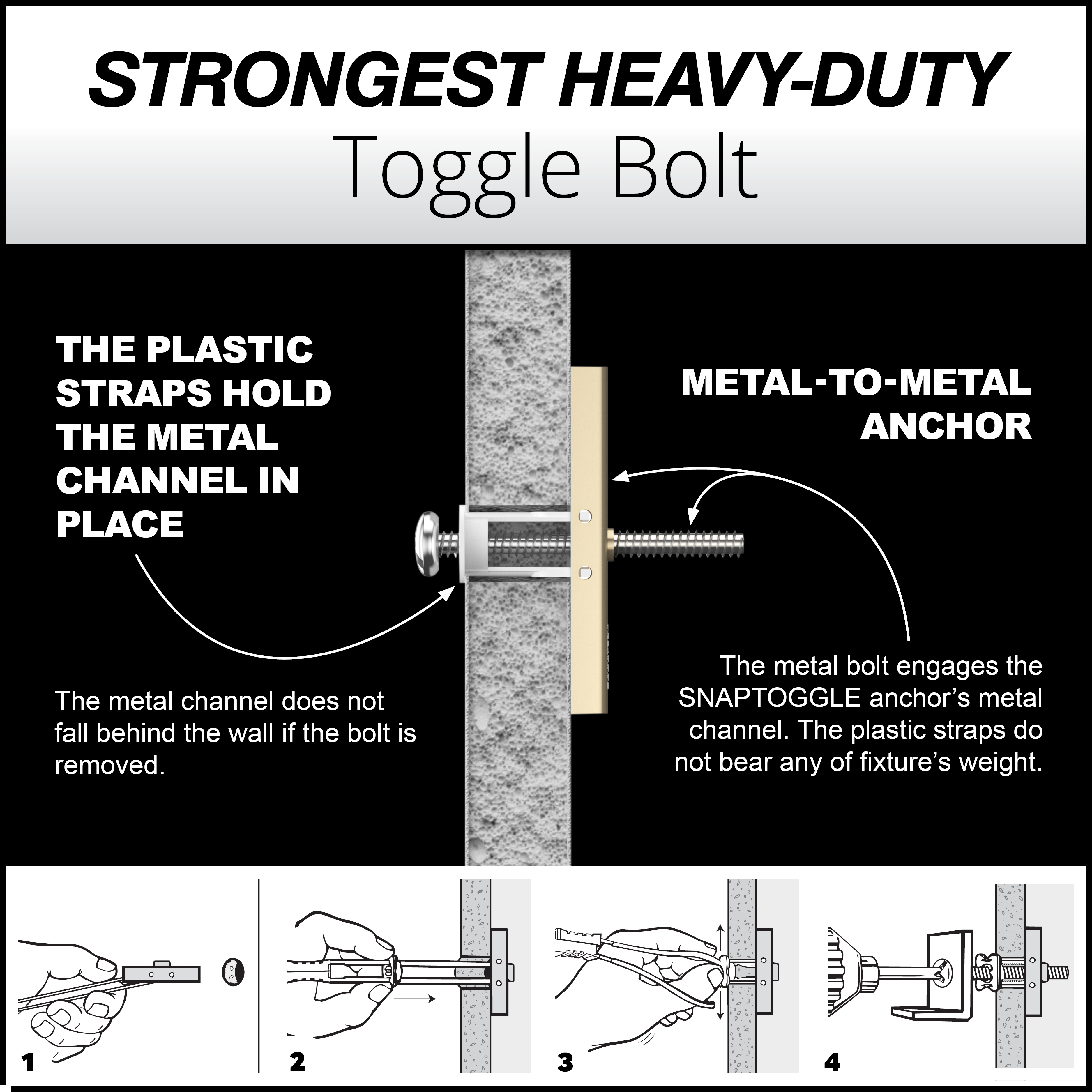SNAPTOGGLE heavy-duty toggle bolts carry twice the load in a smaller hole than standard wing anchors. A patented strap design with sturdier straps and smaller ratchet interval adjusts more precisely and snaps off flush to the surface.