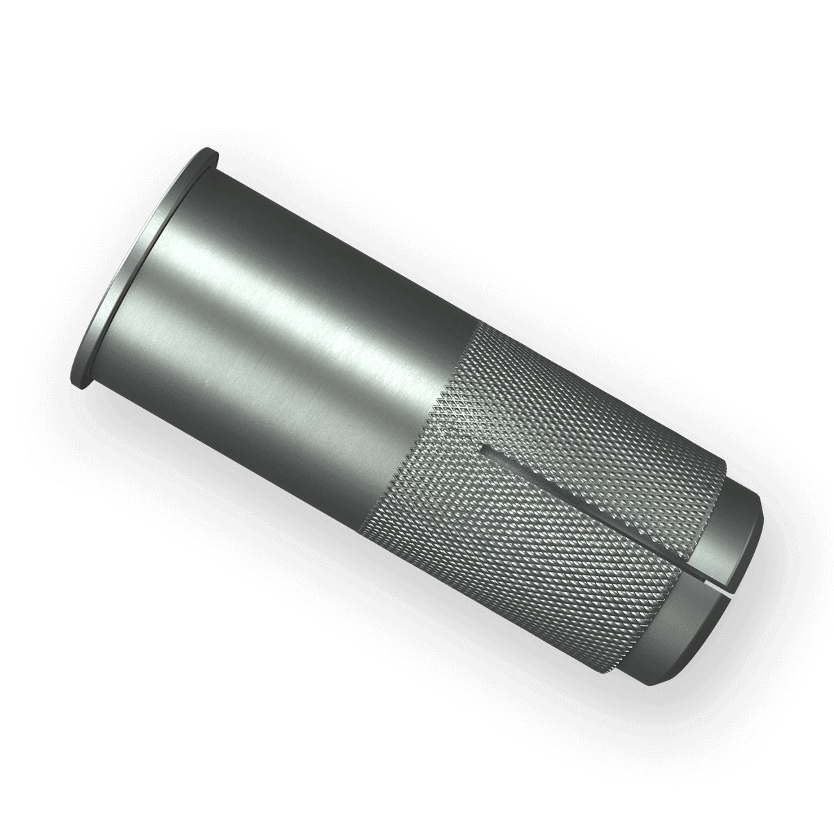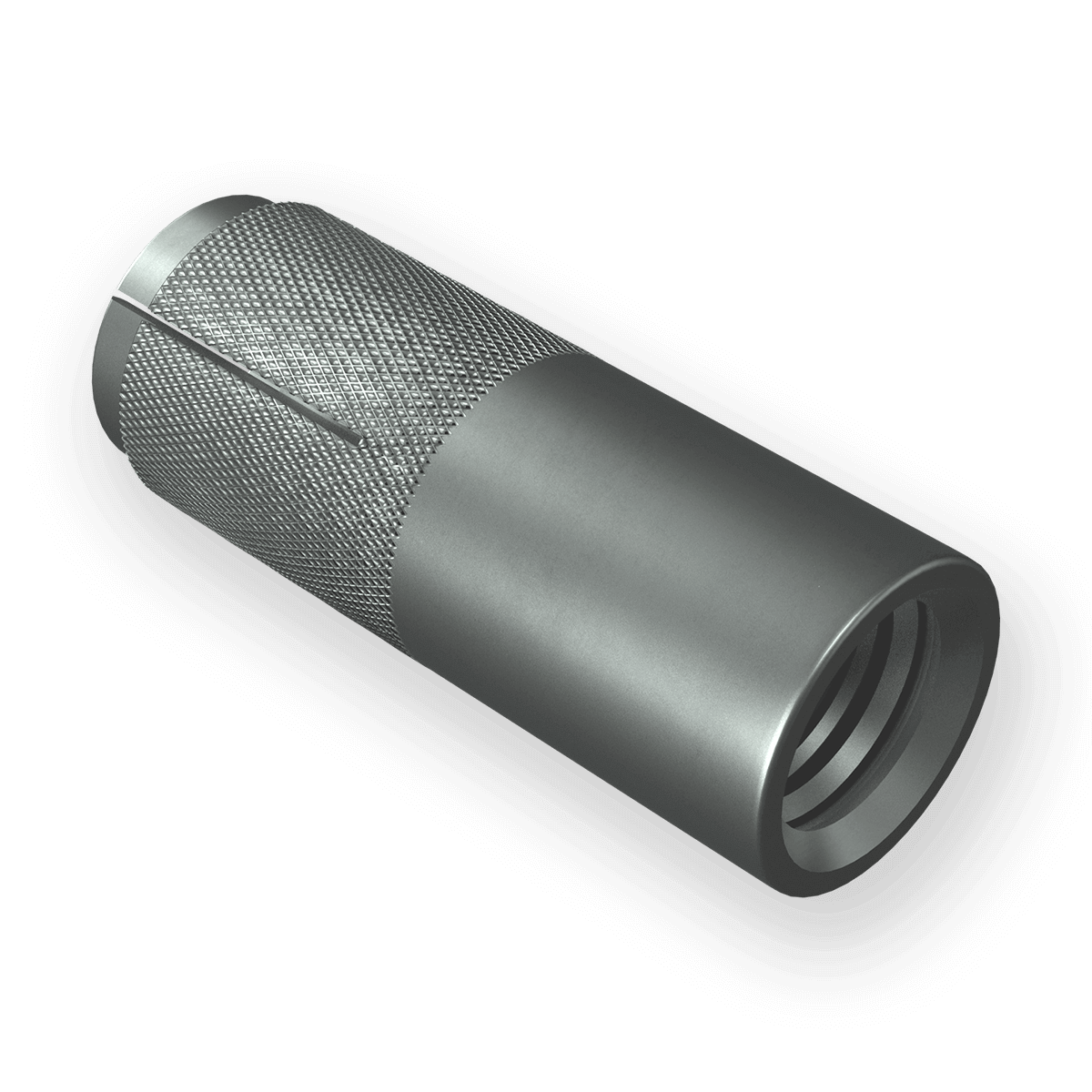 This internally threaded flush-mount expansion anchor features a knurled body that increases friction between the anchor body and the internal walls of the hole.