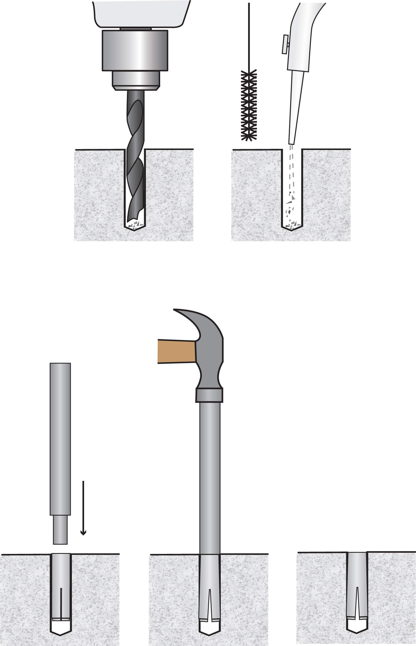 - Insert the setting tool into the threaded end of the anchor and expand the anchor by striking the end of the setting tool with a hammer. The anchor is set (fully expanded) when the shoulder of the setting tool touches the anchor. Full expansion is necessary for proper anchor performance.